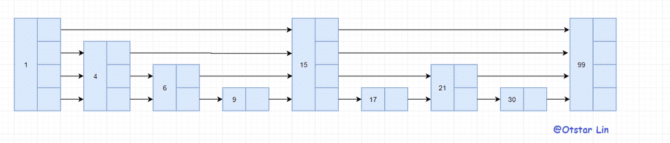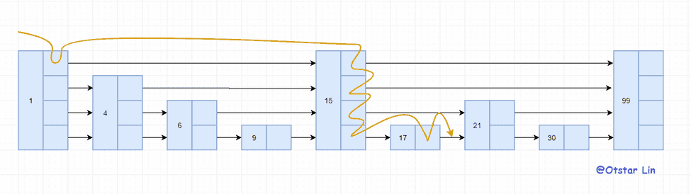 那么如何能提高查找效率呢?在 O(n)的时间复杂度下如果要提高运行效率,二分是必不可少的,树结构可以通过左右子树来分区,那链表又如何分区呢?建立索引,我们对这个链表加上一层索引。